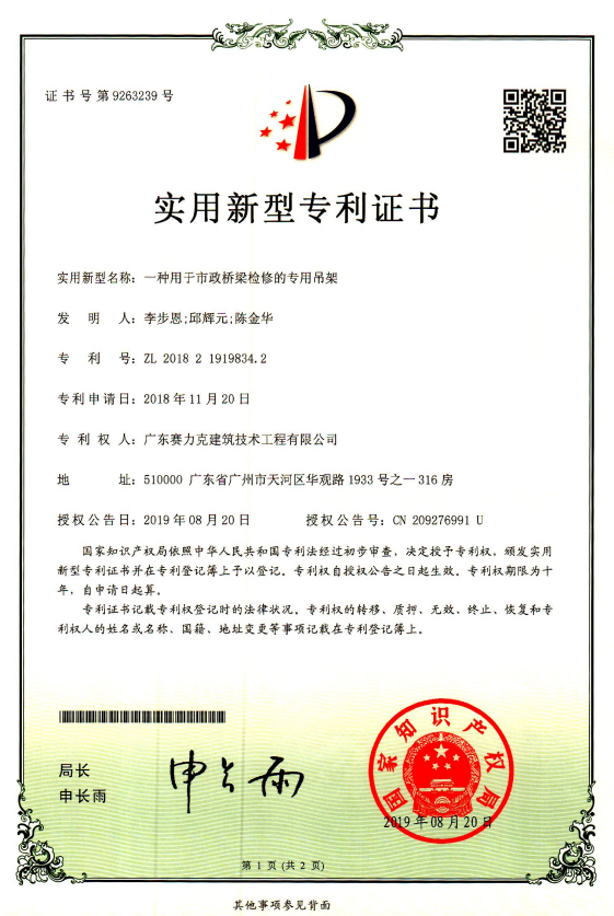 瀏覽量:1786 發(fā)布時間:2019.12.07由廣東賽力克建筑技術(shù)工程有限公司研發(fā)團隊研發(fā)的“一種用于市政橋梁檢修的專用吊架”于2019年8月20日獲中華人民共和國國家知識產(chǎn)權(quán)局授予實用新型專利證書。專利號:ZL 2018 2 1919834.2。