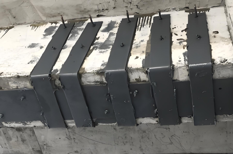 粘鋼外掛法:將膠粘劑均勻涂敷在梁面,再將預(yù)先制作好的鋼板或鋼筋網(wǎng)固定在梁面上,壓實(shí)并確保與混凝土梁充分粘結(jié)。