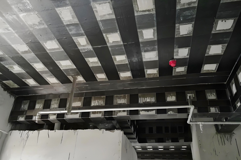碳纖維加固對樓板抗壓承載力提升作用有限,若樓板因混凝土強度嚴(yán)重不足(如 C15 以下)或受壓區(qū)混凝土破損嚴(yán)重導(dǎo)致的承載力問題,需結(jié)合增大截面、置換混凝土等技術(shù)聯(lián)合加固;此外,碳纖維材料耐高溫性能較差,在高溫環(huán)境(如廠房鍋爐房、冶煉車間)中需額外設(shè)置防火保護(hù)層(耐火極限需滿足設(shè)計要求)。